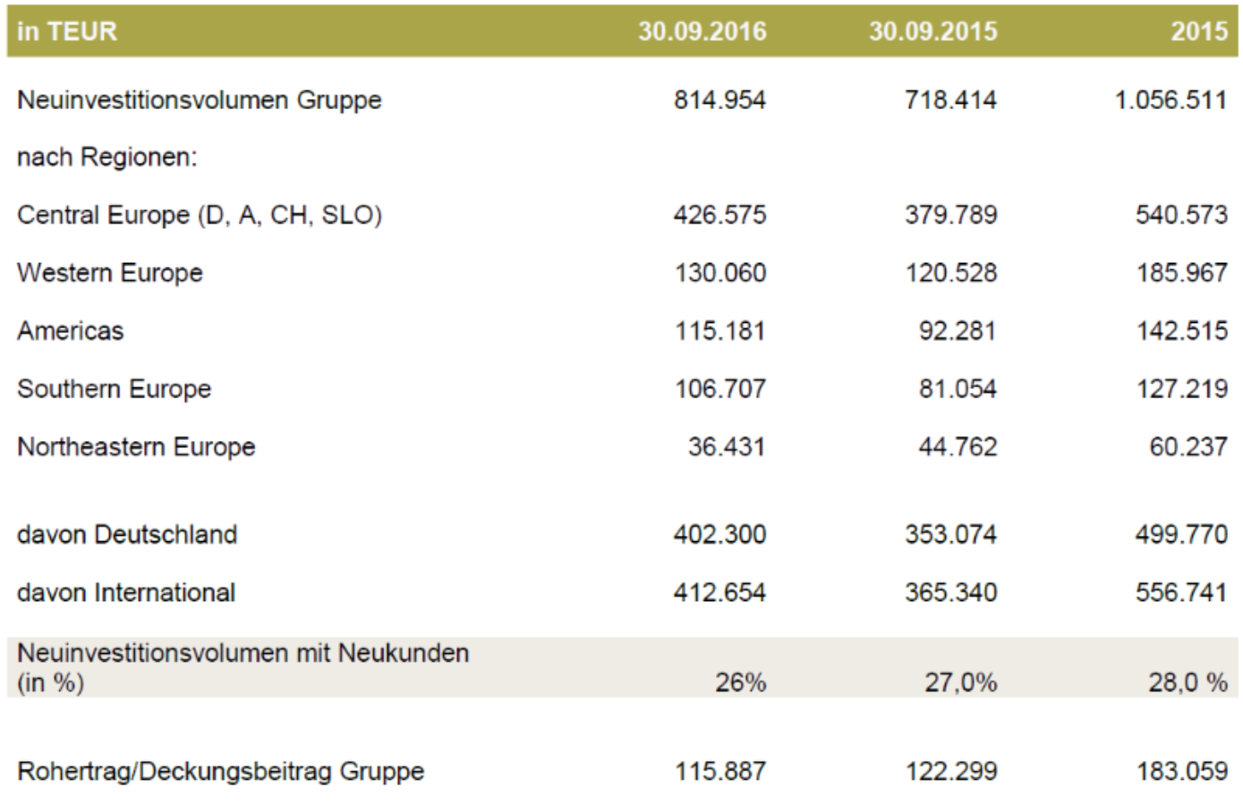 CHG-MERIDIAN's growth was very positive in most European regions. In the Southern Europe region, the volume of leases originated was up by 31.6 percent compared with the prior-year period to €107 million (Q1–Q3 2015: €81 million). The growth rate in the Western Europe region was 7.9 percent, with lease originations rising to €130 million (Q1–Q3 2015: €121 million). Central Europe was the largest region by volume, with lease originations advancing by 12.3 percent to €427 million (Q1–Q3 2015: €380 million). However, the volume of leases originated in the Northeastern Europe region fell slightly.