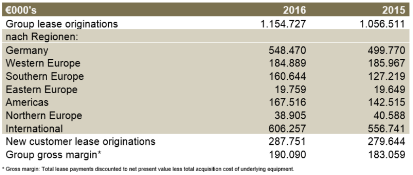 There was particularly encouraging growth in the Southern Europe region (Italy, Spain, France), where the volume of leases originated increased by around 26 percent to reach €161 million (2015: €127 million). The Americas region (USA, Canada, Mexico, Brazil) also made an exceptionally strong contribution to the Group's overall total, with lease originations climbing by around 17 percent to €167 million (2015: €142 million). In its domestic market of Germany, CHG-MERIDIAN's lease originations increased at a healthy rate of around 10 percent to €548 million (2015: €500 million).