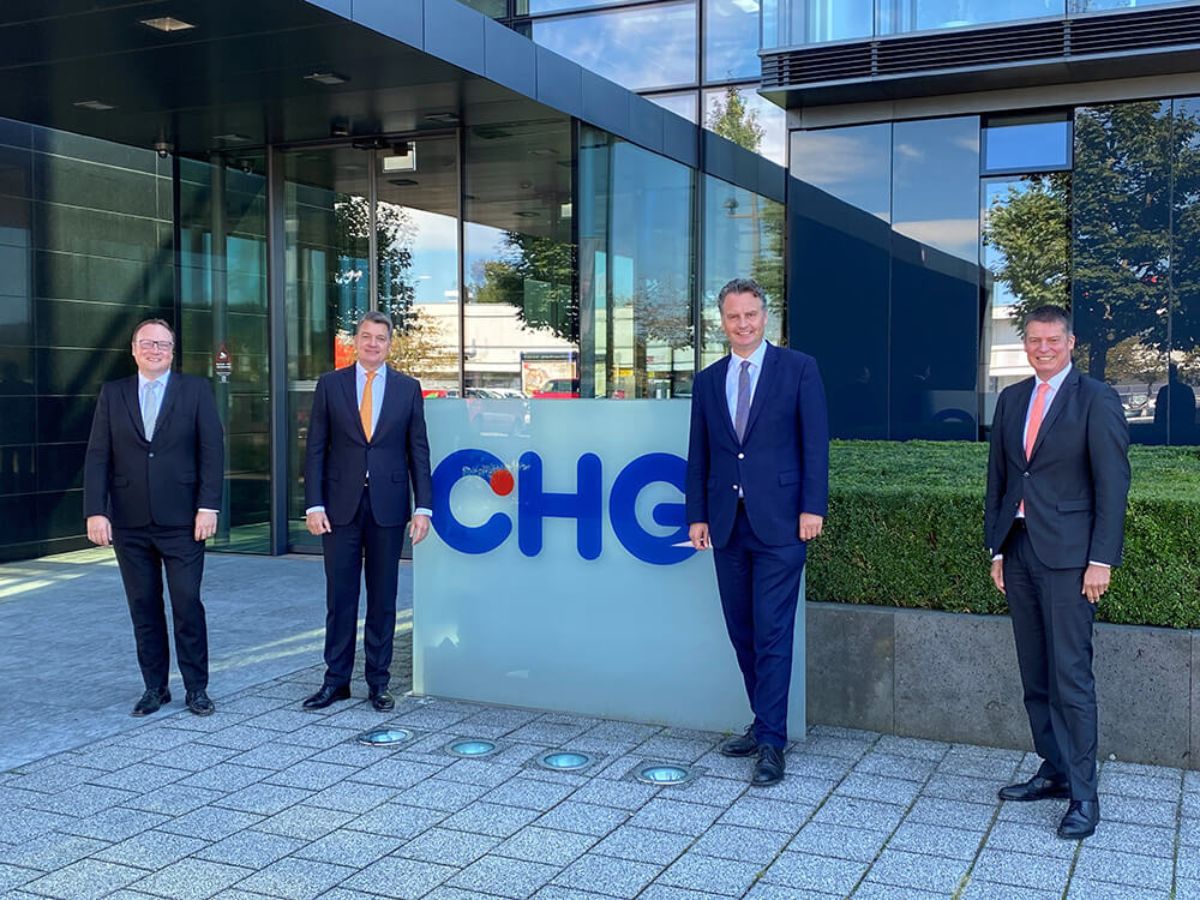 From left to right: Frank Schöneberg and Dr. Mathias Wagner (both from CHG-MERIDIAN) together with State Secretary Prof. Dr. Günter Krings and Member of the German Parliament Axel Müller in front of CHG-MERIDIAN's headquarters in Weingarten