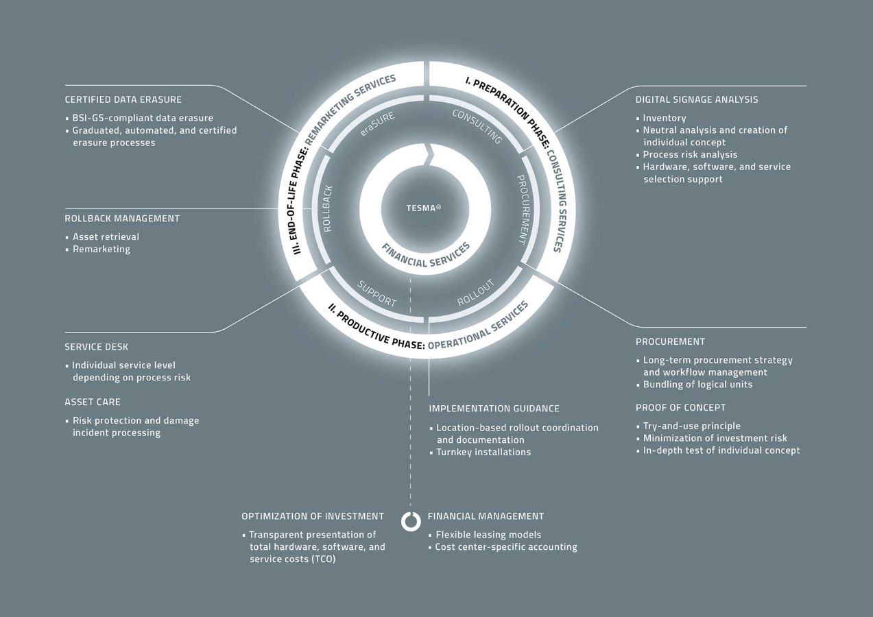 At CHG-MERIDIAN we focus on complete rather than on individual solutions. “Our digital signage solutions guarantee a complete service, from financing to administration and remarketing,” Schorer explains. Digital signage projects offer almost unlimited customizability and performance. Such wide-ranging solutions and projects require an in-depth knowledge of technology and financing. Whereas other companies have a limited range of experts and thus cover only one area of specialism, CHG-MERIDIAN, a non-captive specialist based in Weingarten, provides technology management and financing as part of a sophisticated overall concept. The company also combines all its services with an interdisciplinary mix of experts, and its multidisciplinary approach removes one of the biggest hurdles for digital signage projects.