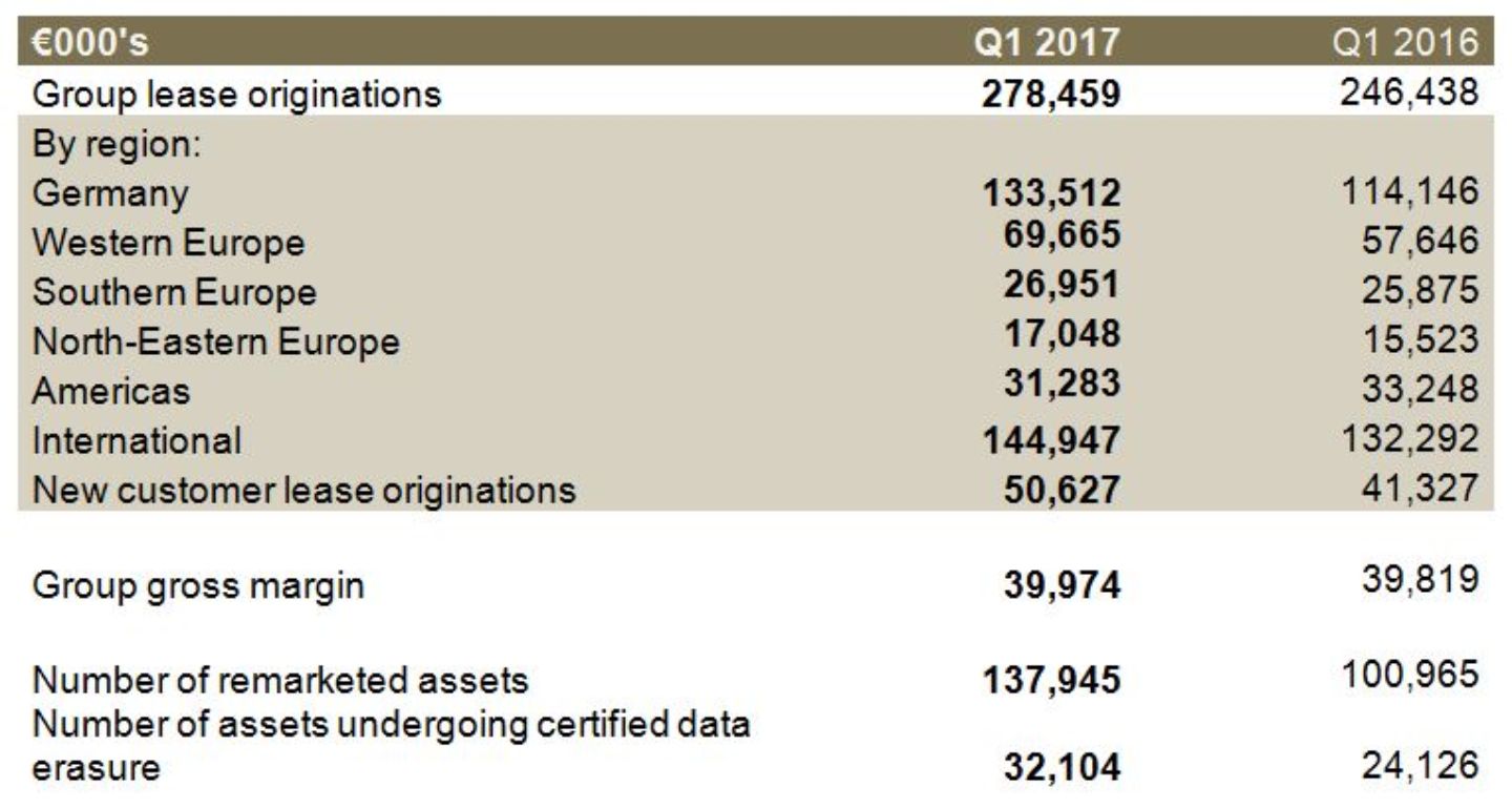 Business in Germany grew at an even faster rate, rising by 17 percent to €133 million and thus accounting for a bigger share of total lease originations (Q1 2016: €114 million). The overall volume of leases originated with new customers was in excess of €51 million (Q1 2016: €41 million).