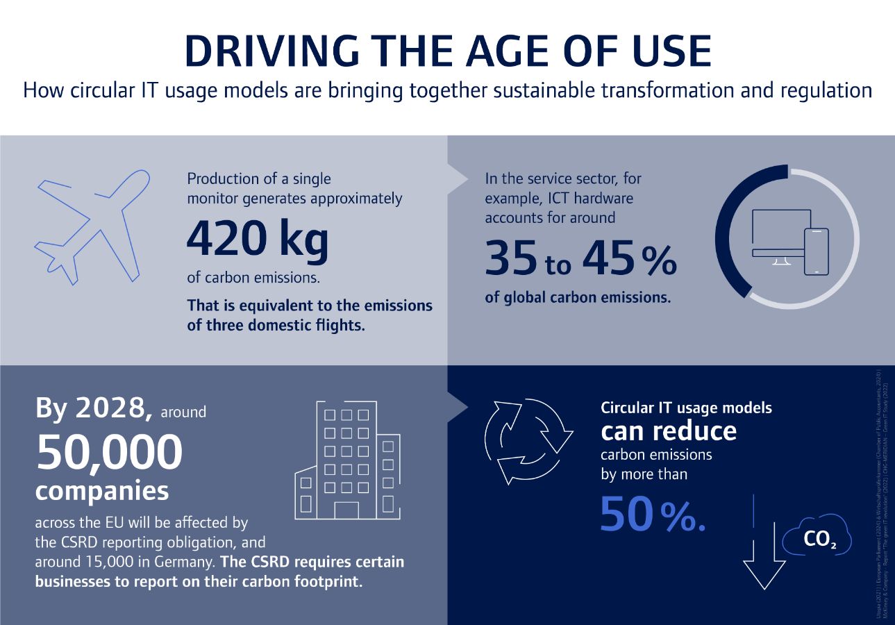 Innovative usage models based on the circular economy allow customers to reduce running costs while maximizing their sustainability performance. The latter is becoming increasingly important for companies as digital technologies often account for a significant share of a company’s total emissions. According to a study by McKinsey, ICT hardware alone is responsible for 35-45 percent of total CO2 emissions in the service sector, for example. “There is enormous potential for savings here, and there is often little awareness of it,” says Wagner. By switching to innovative technology2use solutions based on effective lifecycle management, companies can reduce their IT hardware’s CO2 emissions by more than 50 percent.